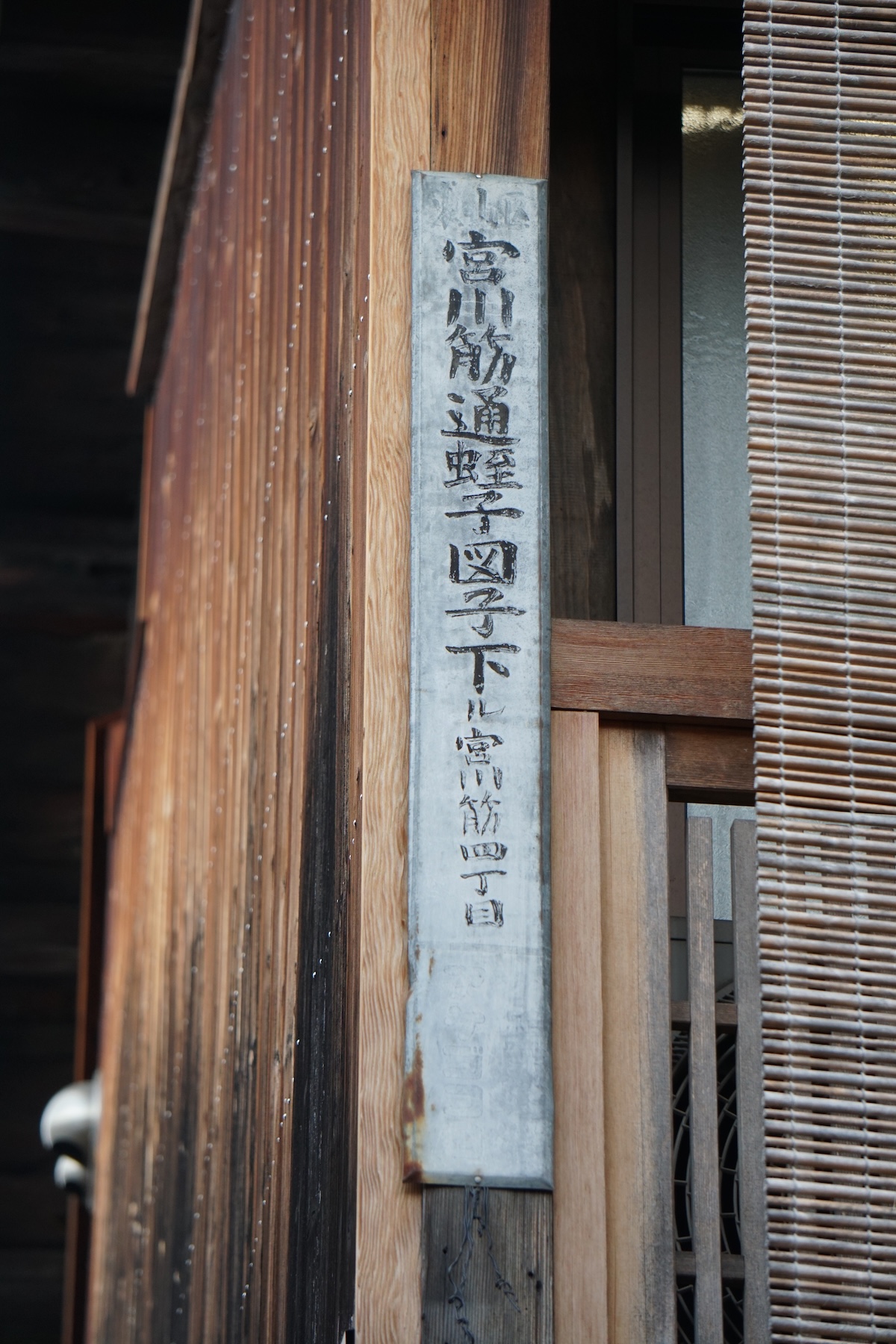 京都の町名表示板というと仁丹が有名ですが、それ以外の主体が設置したものもときどき見かけることがあります。この看板には(かなり薄れていますが)「アケゴコロ」とありますね。通り名としては「宮川筋通」と書かれており、仁丹の「宮川町通」とも、「新宮川筋」に対応する「宮川筋」とも異なる名前ですが、検索すると確かに用例が結構出てきます。そこで「新宮川筋通」も検索に掛けてみると、同様に見つかります。どちらも民間の記事のみならず京都市の資料にも現れるので、公的にも可能な揺れの範囲内みたいですね。