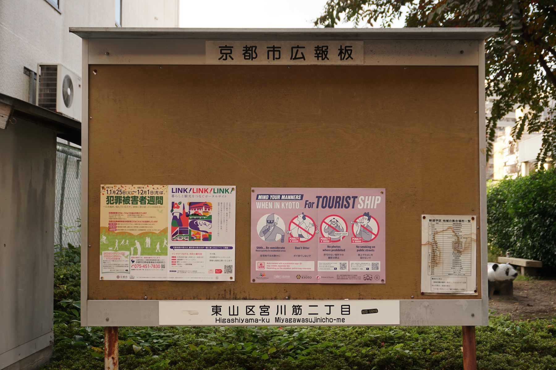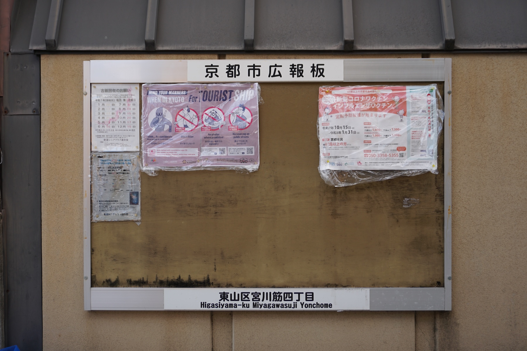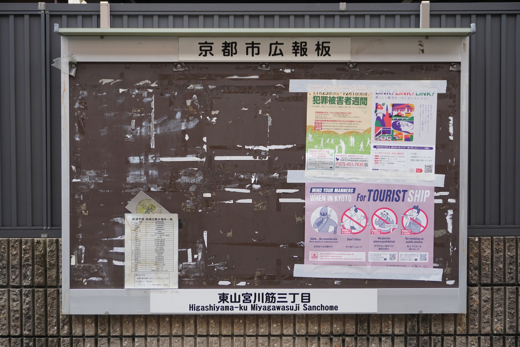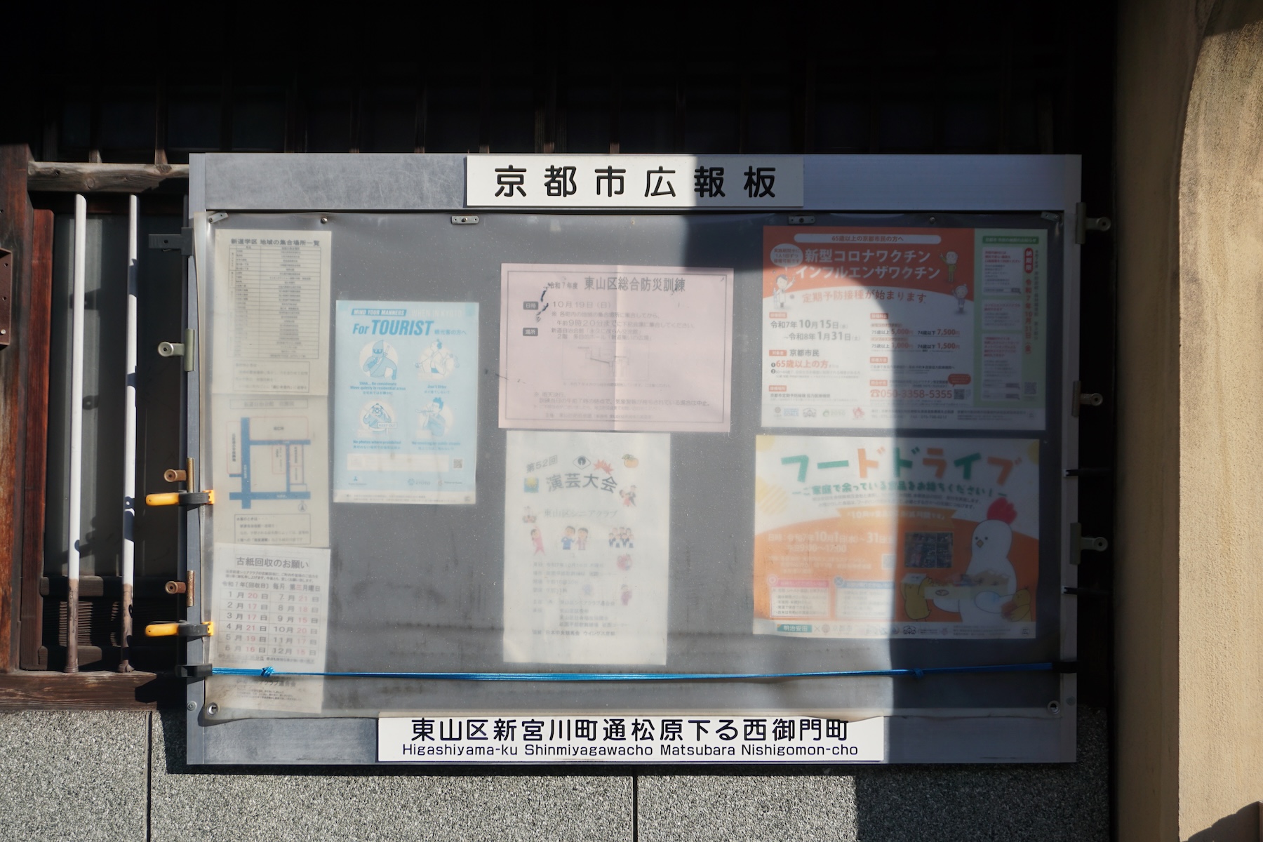 よくある広報板に近いです。「宮川筋二丁目」はローマ字にすると一語扱いらしいのが引っかかります。同じくスペーシングの話として、「(東山)区宮(川筋)」の間にスペースがないですね?