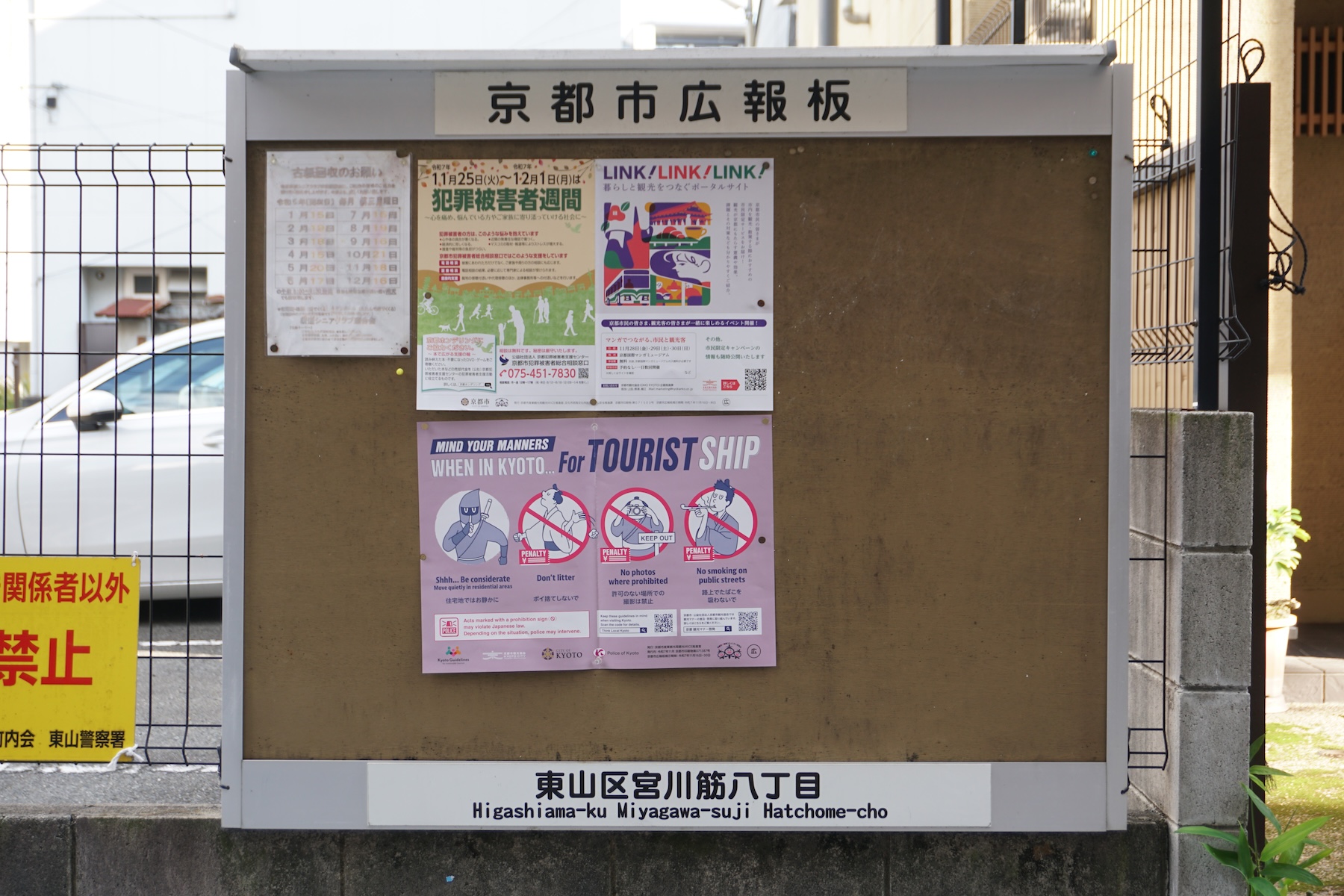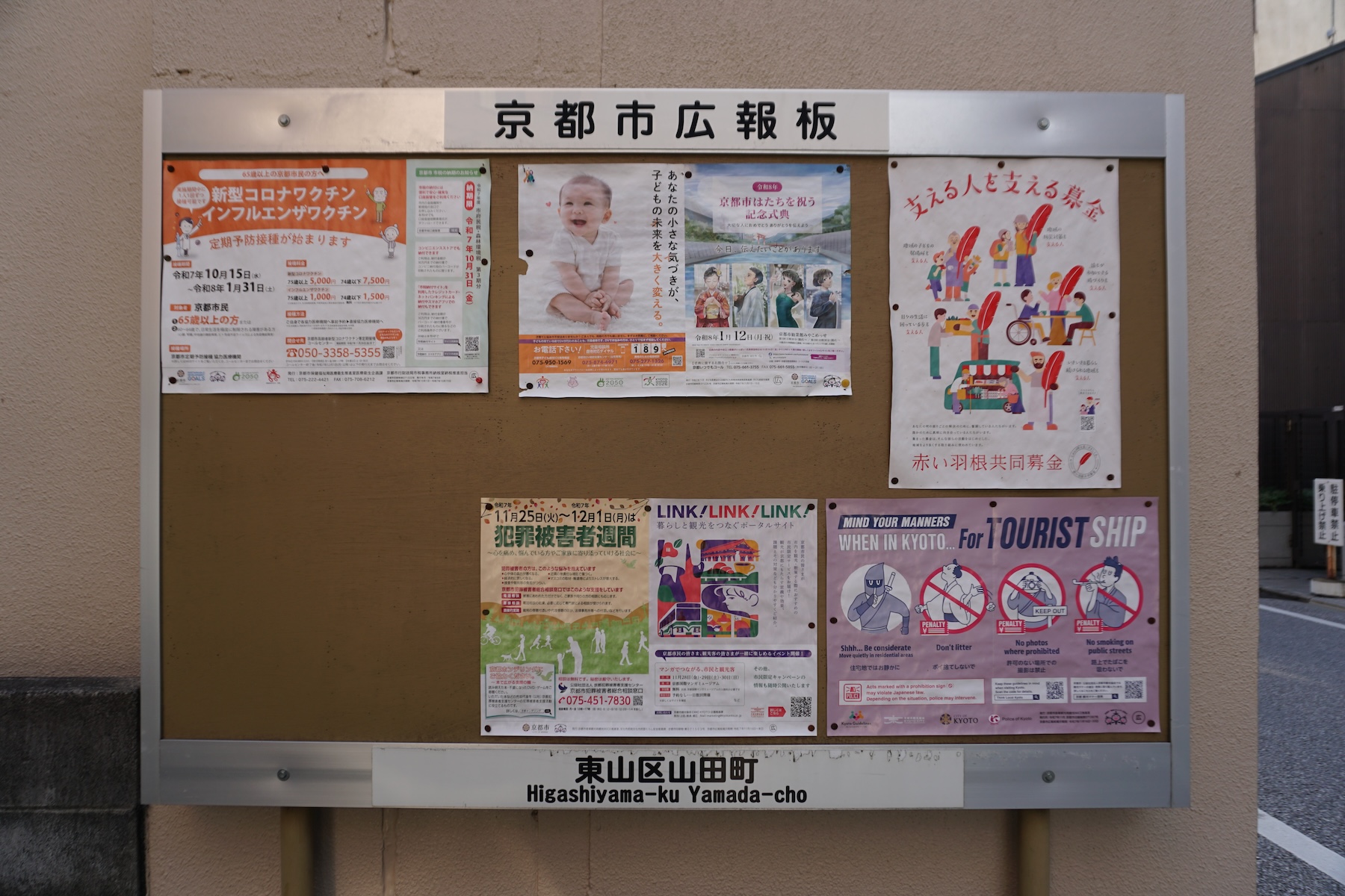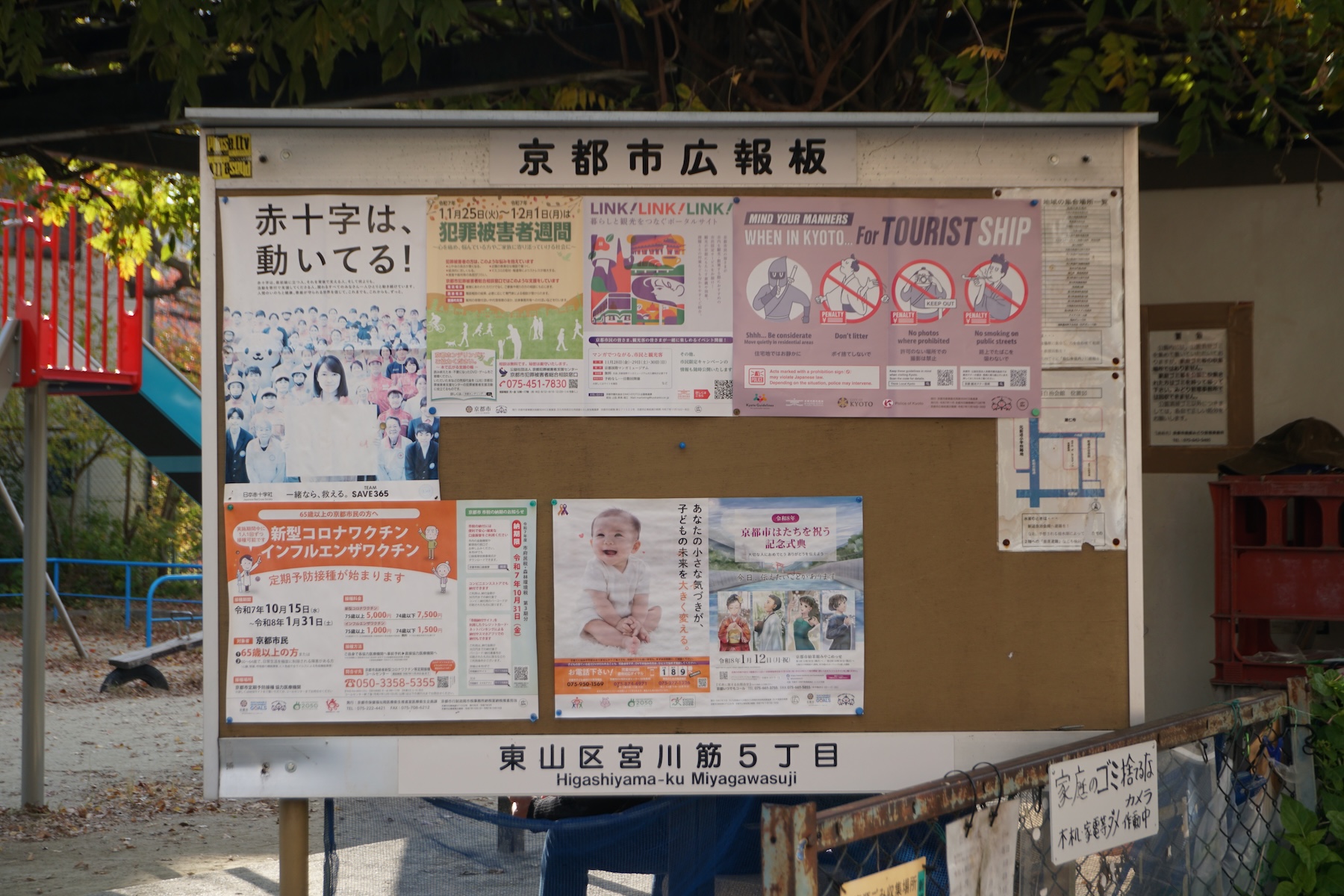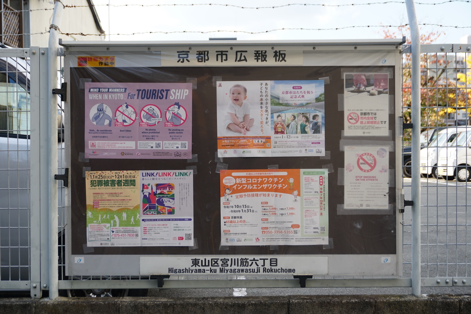 よくある広報板に近いです。「宮川筋二丁目」はローマ字にすると一語扱いらしいのが引っかかります。同じくスペーシングの話として、「(東山)区宮(川筋)」の間にスペースがないですね?