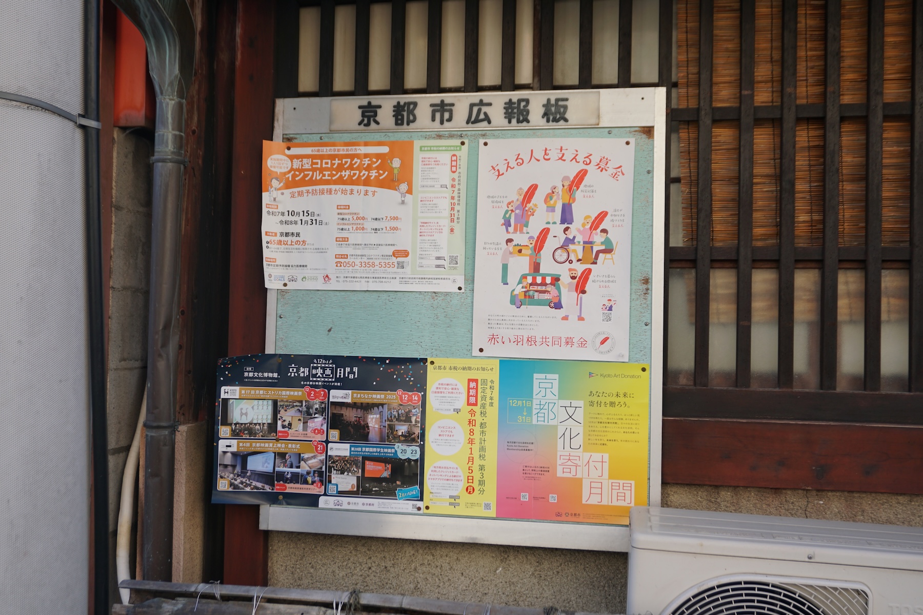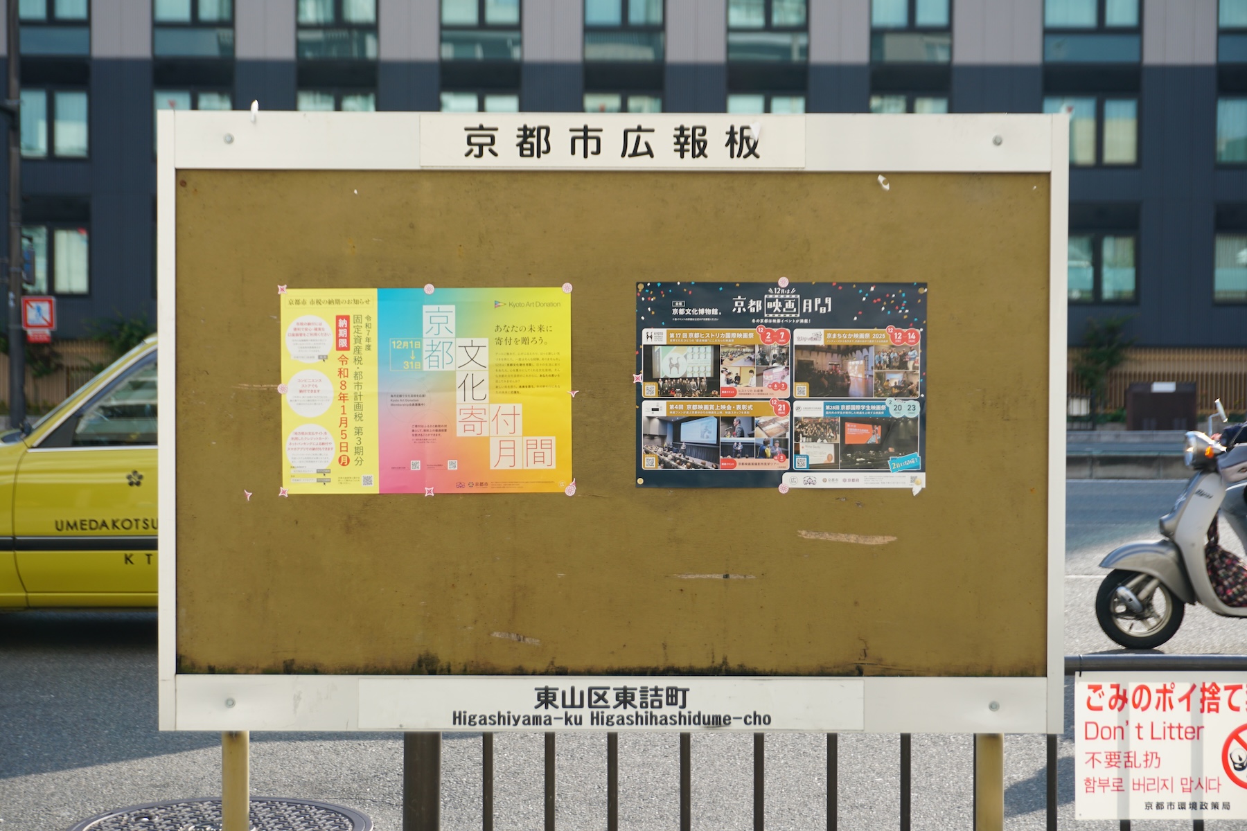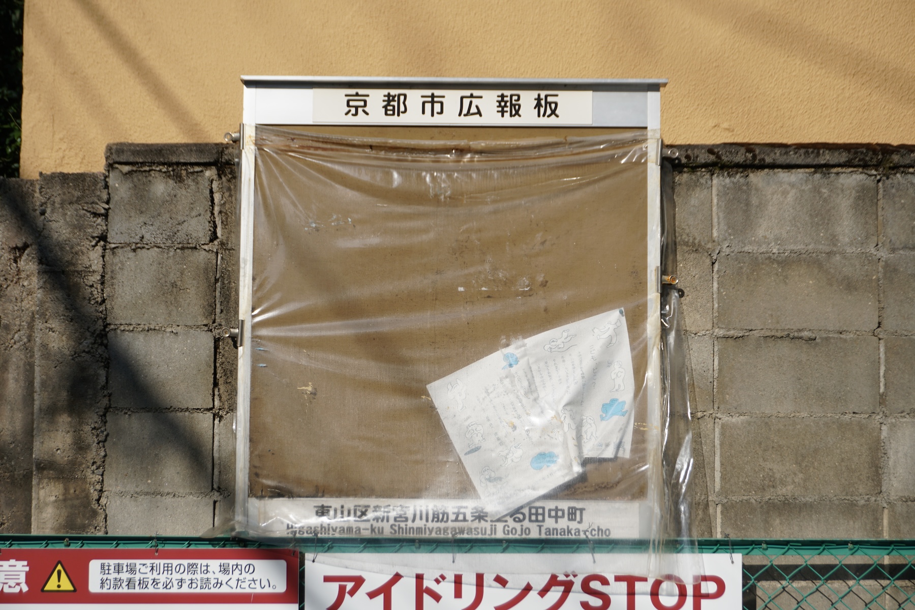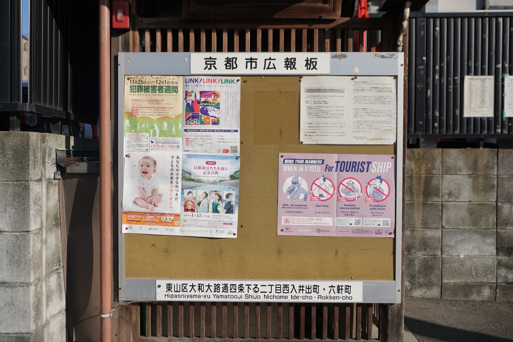よくある広報板に近いです。「宮川筋二丁目」はローマ字にすると一語扱いらしいのが引っかかります。同じくスペーシングの話として、「(東山)区宮(川筋)」の間にスペースがないですね?